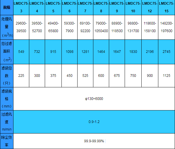二、LMDC低壓脈沖長布袋除塵器技術(shù)參數(shù)表: